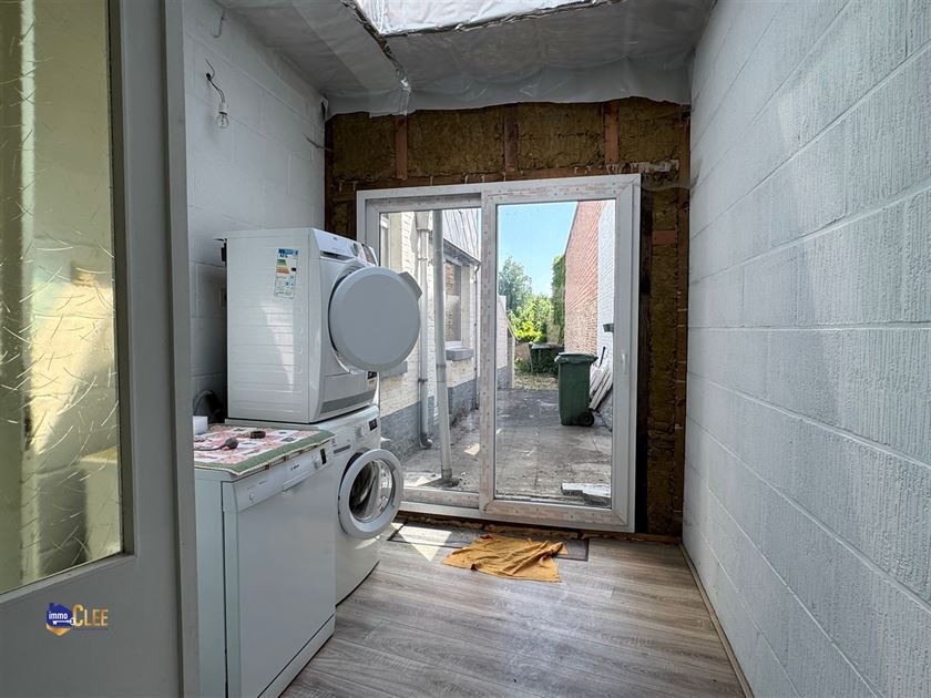 Op het gelijkvloers betreedt u de woning via een inkomhal die leidt naar de leefruimte en aansluitend de keukenruimte. In deze keuken werden reeds enkele verbouwingswerken uitgevoerd; de nieuwe keuken (zonder toestellen) is aanwezig en inbegrepen in de verkoop, maar dient nog geïnstalleerd te worden. Verder vinden we op het gelijkvloers een praktische berging en een apart toilet.