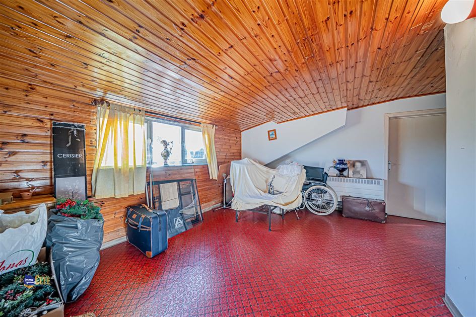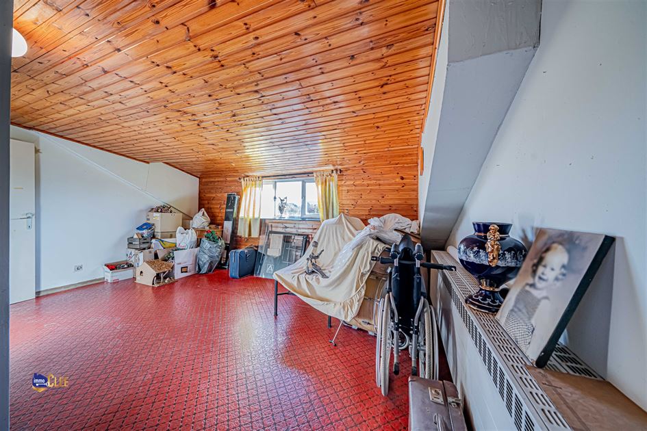 Via een vaste trap bereiken we de zolderverdieping, waar één slaapkamer reeds werd afgewerkt. De overige zolderruimte kan verder worden ingericht en biedt mogelijkheden voor extra kamers, zoals een hobbyruimte. De woning is volledig onderkelderd en ingedeeld in meerdere praktische ruimtes zoals een provisiekelder, technische ruimte en opslagruimtes.