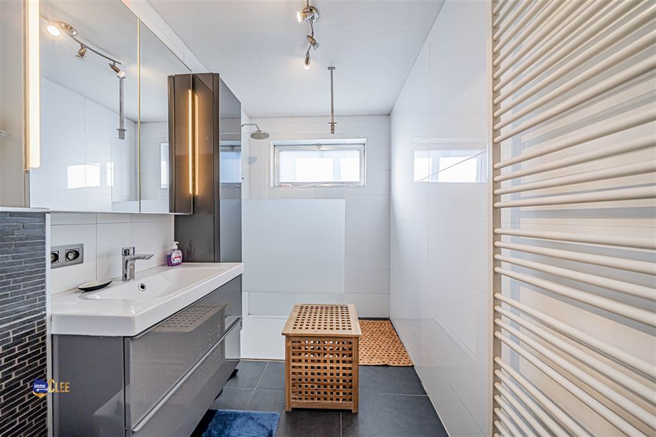Bij het betreden van de woning komen we binnen in de inkomhal die uitgeeft op de leefruimtes. De ruime, lichtrijke living biedt toegang tot de keuken en eetkamer. Het gelijkvloers beschikt verder over twee volwaardige slaapkamers met daartussen een recente badkamer, uitgerust met een moderne inloopdouche.